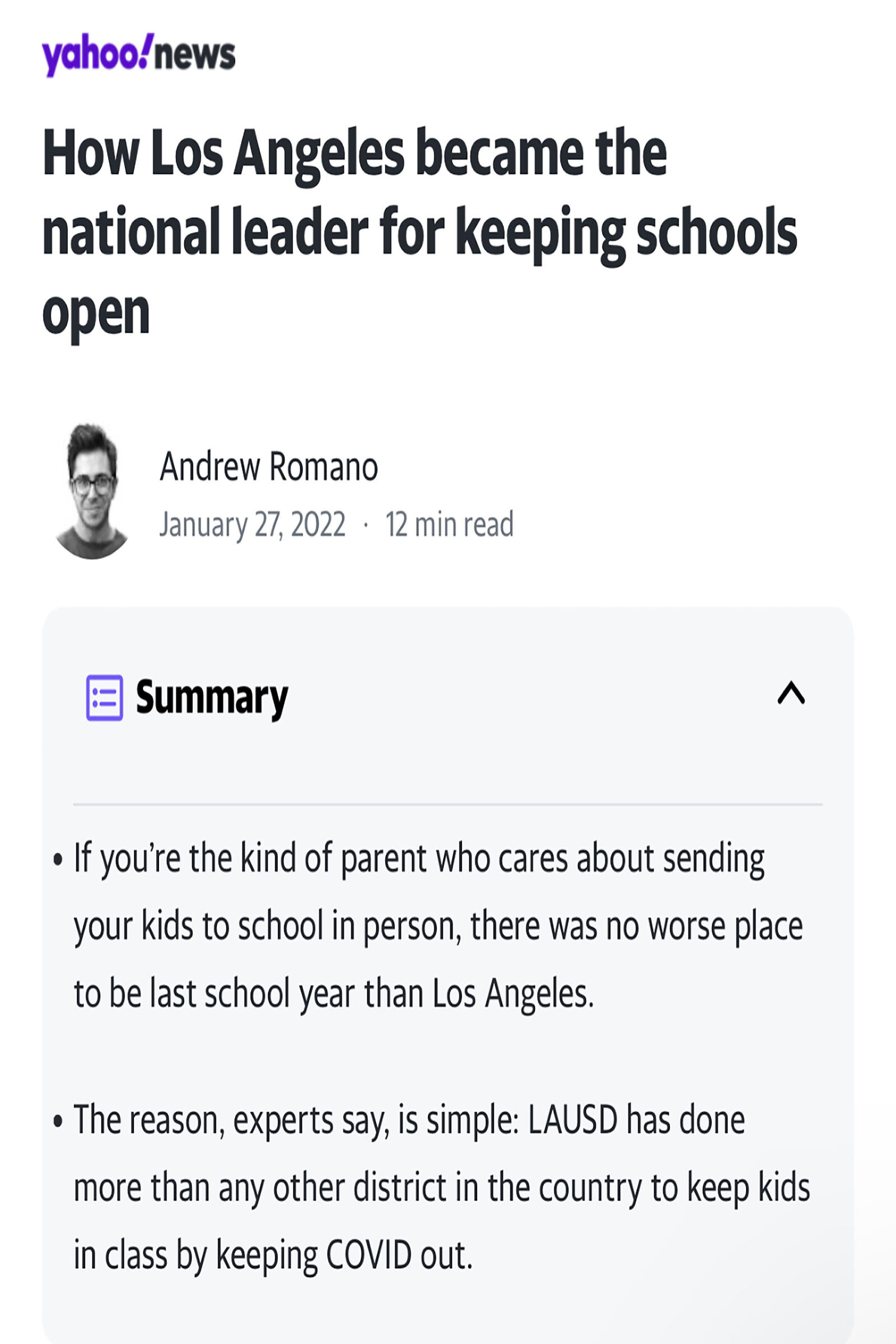 As Chief Medical Director of Los Angeles Unified School District, I lead all the medical services of the District. I provided leadership for health emergency preparedness and response through the COVID-19 pandemic. While supervising the COVID testing and vaccination program for 500,000 students and 75,000 employees, I helped to lead the efforts to reopen schools and keep over 1700 schools safe and open throughout the pandemic. In addition, I led the efforts to bring Narcan (naloxone) to all K-12 schools in response to the Fentanyl crisis.